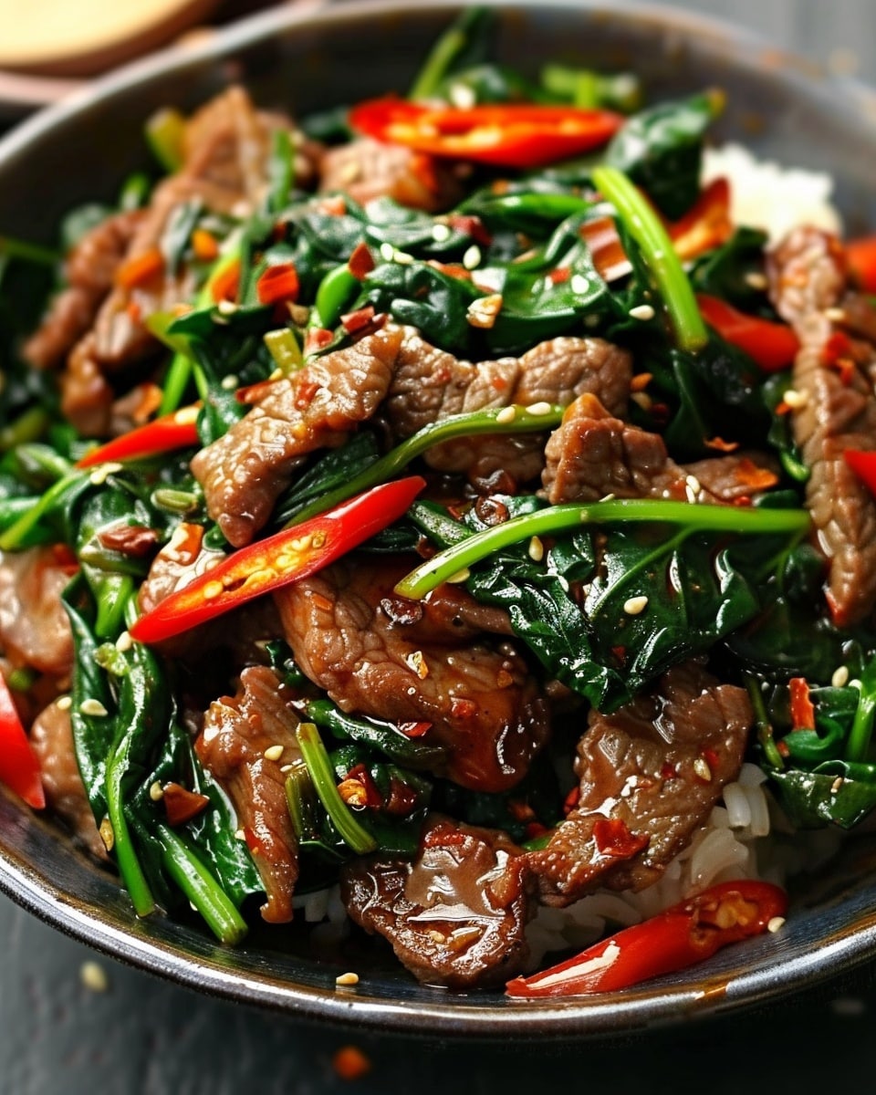 Chili garlic beef and spinach stir-fry is one of those quick, punchy meals I love to make when I want big flavor without spending hours in the kitchen. It’s a savory, spicy stir-fry with tender slices of beef, fresh spinach, and a bold chili garlic sauce that clings to every bite. Served over steamed rice or noodles, it’s the kind of dish that satisfies every craving.
