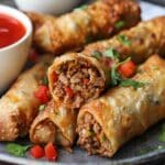 I store leftover eggrolls in an airtight container in the fridge for up to 3 days. To reheat and keep them crispy, I use the oven or air fryer. I also freeze uncooked eggrolls and fry or bake them straight from frozen, adding a few extra minutes to the cook time.