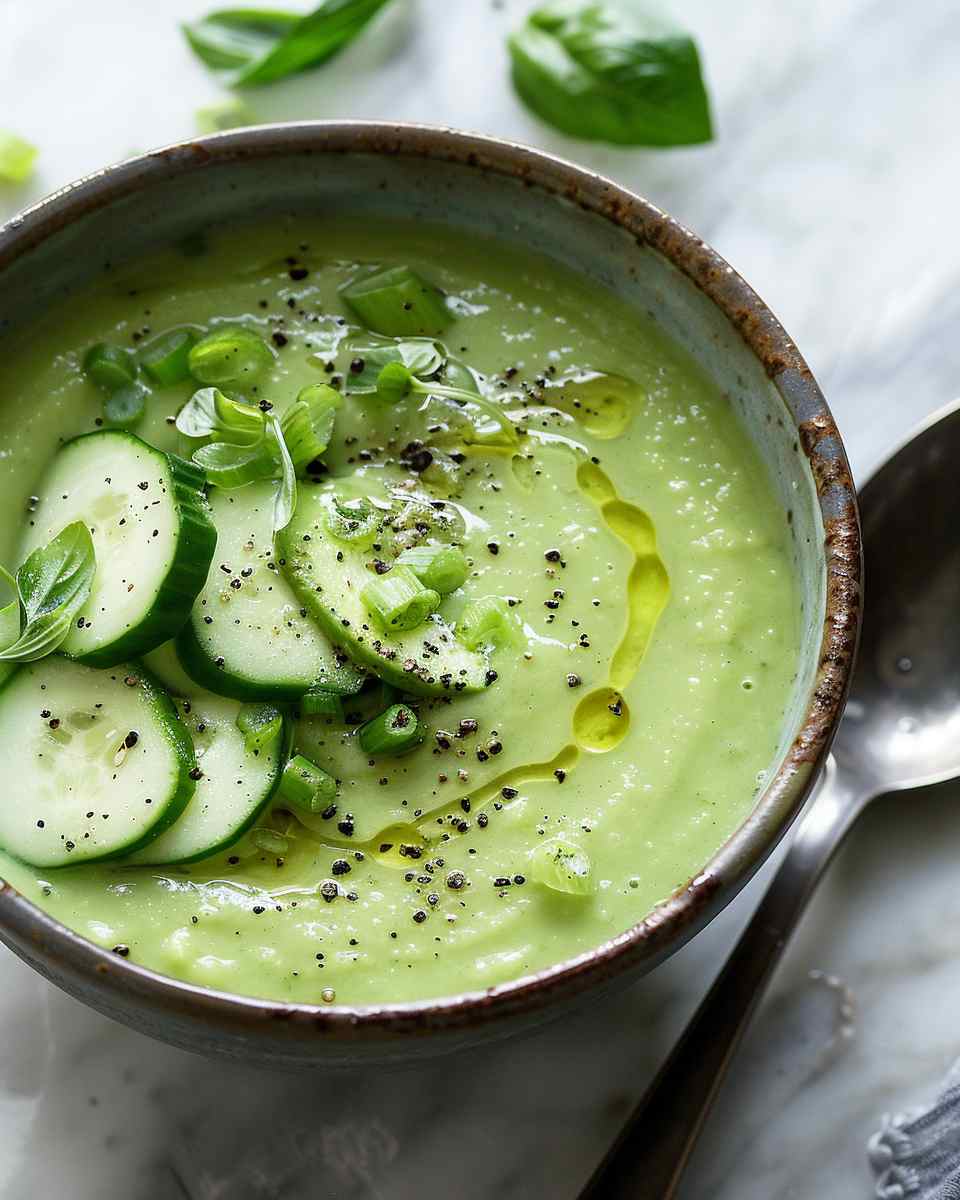 A smooth and refreshing chilled avocado soup with a creamy texture, bright citrus notes, and fresh herbs, perfect for warm days.