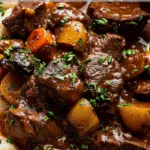 Classic Beef Bourguignon is a hearty French stew made with tender beef chunks slow-cooked in red wine, beef broth, and aromatic herbs. Simmered with carrots, onions, garlic, and mushrooms, it’s a deeply flavorful dish perfect for comforting meals or special occasions.