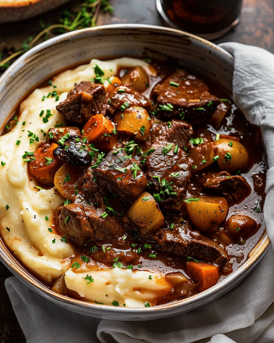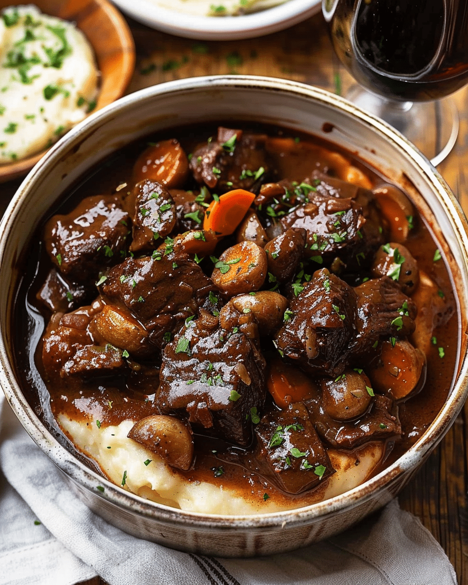 I love how this dish transforms simple ingredients into something luxurious and deeply satisfying. The long, slow simmer makes the beef unbelievably tender, and the red wine sauce develops a richness that’s hard to beat. Whether I serve it on a chilly evening or during a gathering, it always feels like a special occasion on a plate.