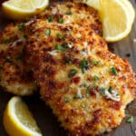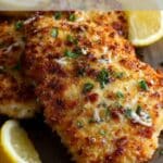 A restaurant-style parmesan crusted chicken featuring juicy seared breasts topped with ranch, mozzarella, parmesan, and a crispy garlic-parmesan breadcrumb crust.