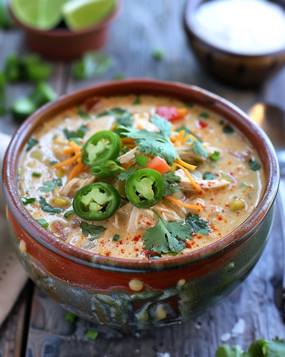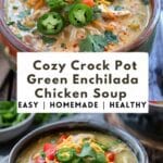 A cozy, creamy slow-cooker soup made with tender chicken, green enchilada sauce, warm spices, and melted cheese for an easy, comforting meal.