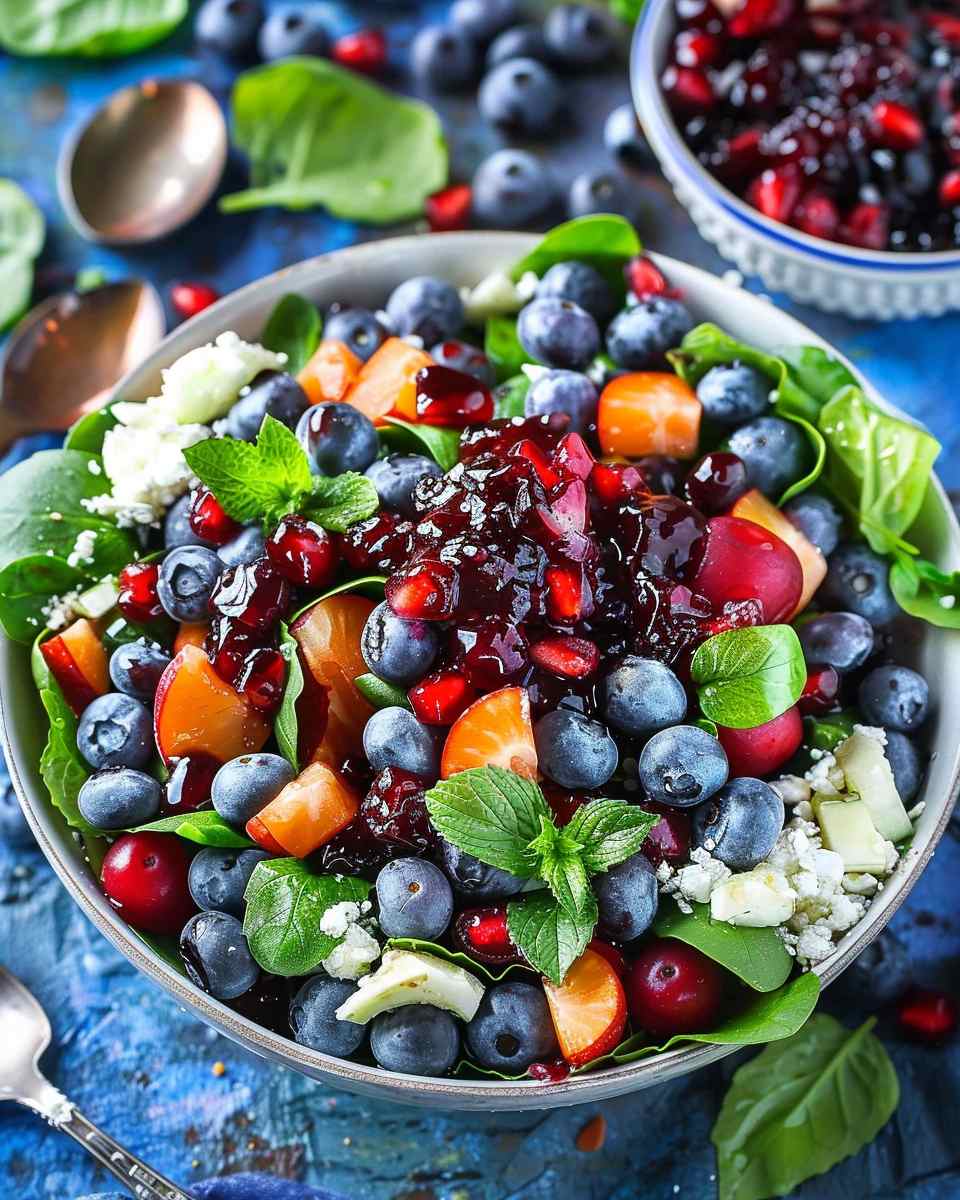 A refreshing cranberry blueberry salad featuring sweet and tart berries, crunchy nuts, and creamy cheese, all tossed in a rich blueberry balsamic dressing.
