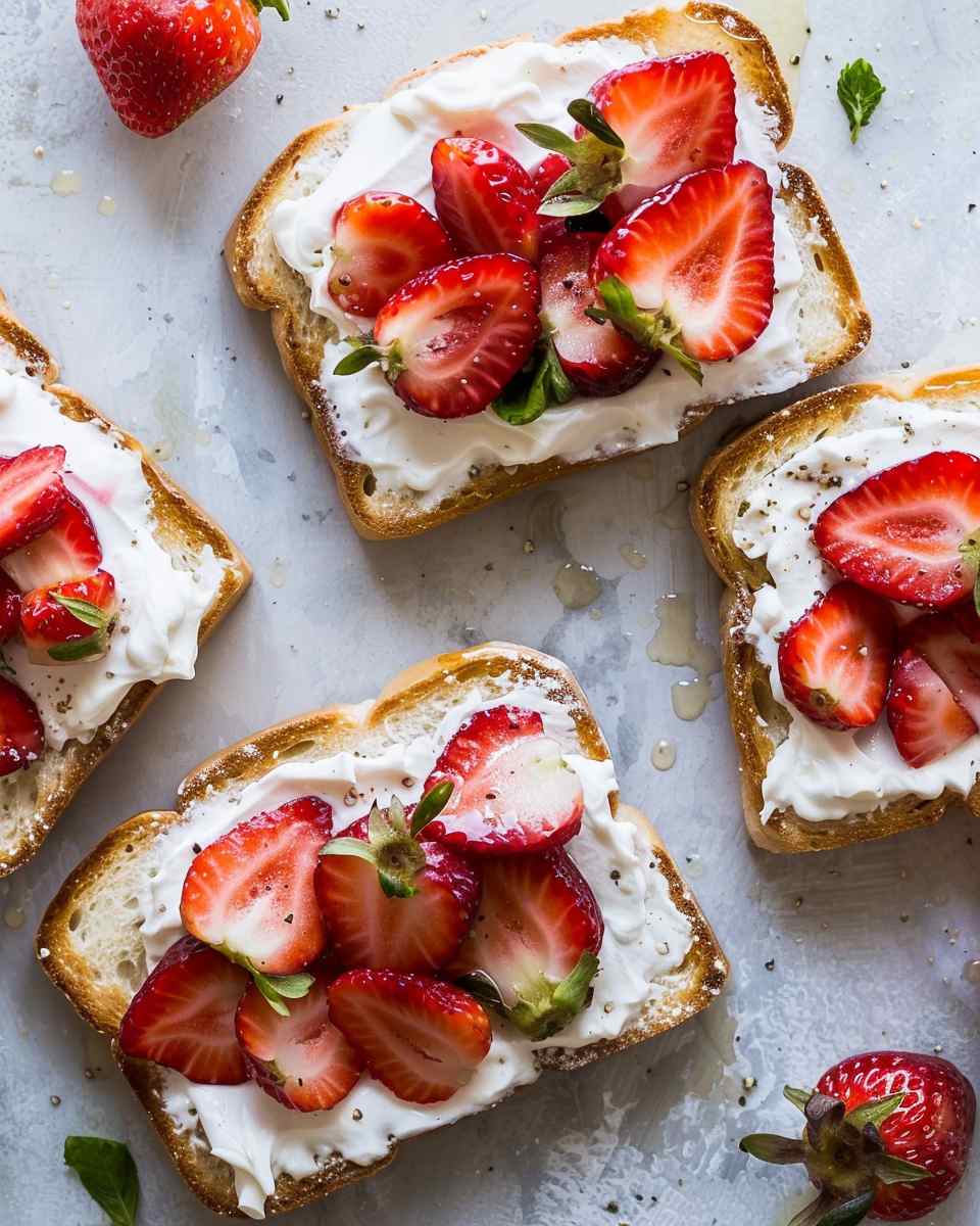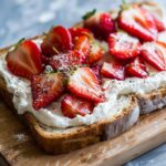 A quick and refreshing toast topped with creamy cheese and sweet strawberries, perfect for breakfast, snacks, or a light dessert.