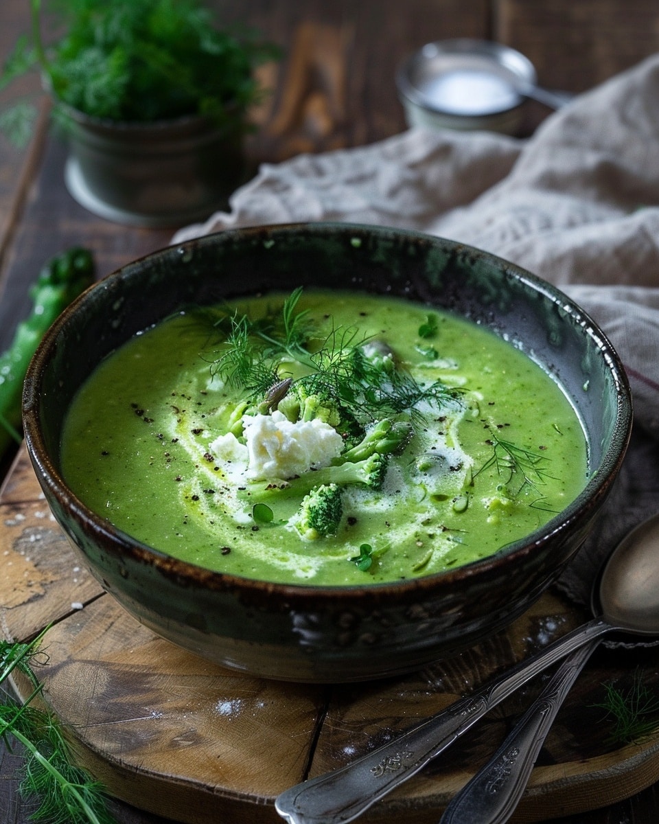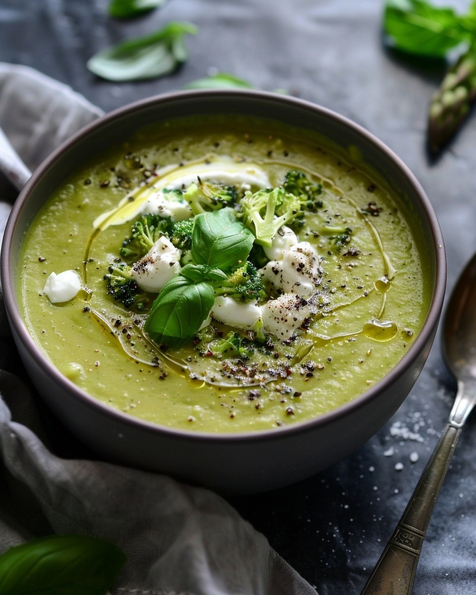 A fresh and velvety Creamy Broccoli Asparagus Soup with Goat Cheese that blends vibrant green vegetables with tangy, rich goat cheese. This comforting yet light soup is smooth, flavorful, and perfect for lunch or dinner.