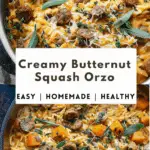 Creamy Butternut Squash Orzo is a cozy, one-pot fall recipe made with tender orzo pasta, roasted butternut squash, and a rich, cheesy sauce. Like risotto but easier, this dish is perfect as a hearty vegetarian main or an elegant side.