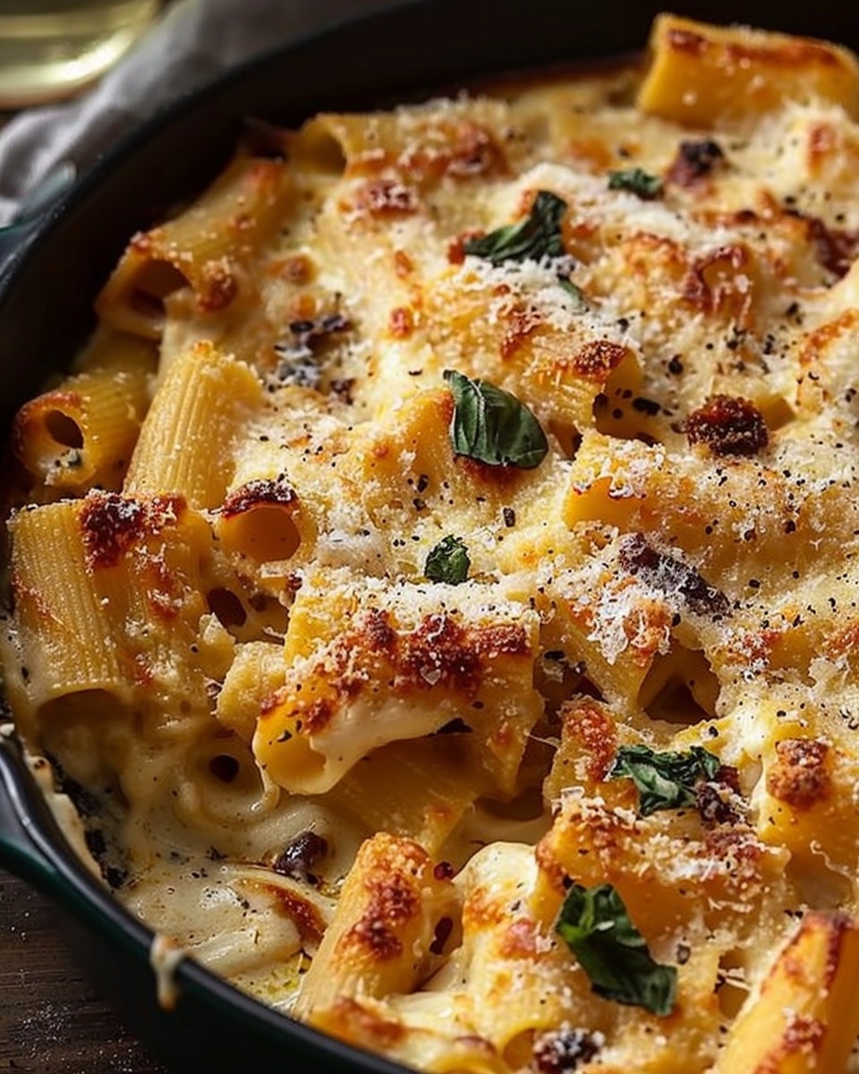 - Bake for 20–25 minutes until bubbly and golden. Broil for 2–3 minutes if desired.