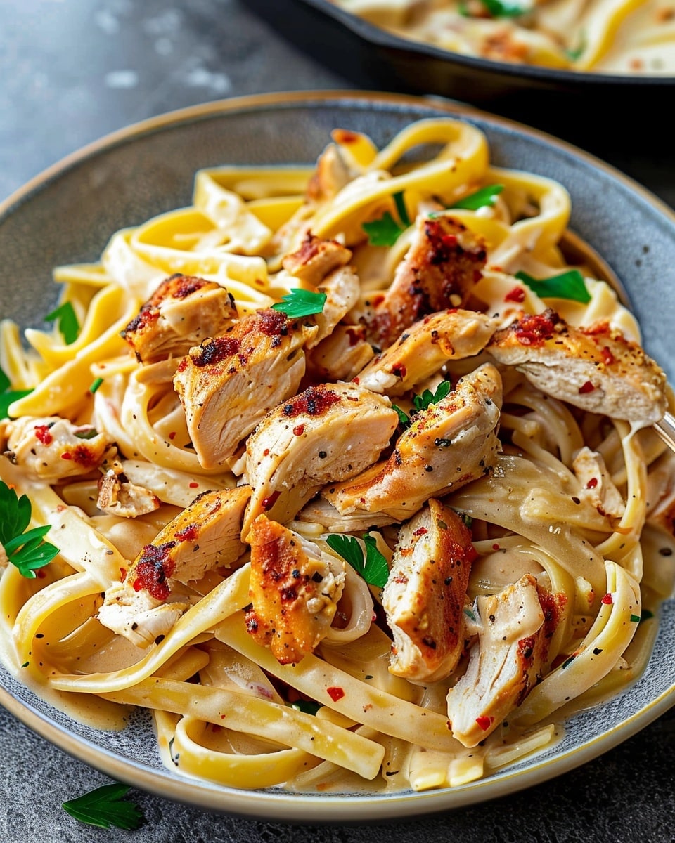 - Return chicken to the skillet. Add cooked pasta and toss to coat with the sauce. Add a splash of pasta water or broth if needed to thin the sauce.