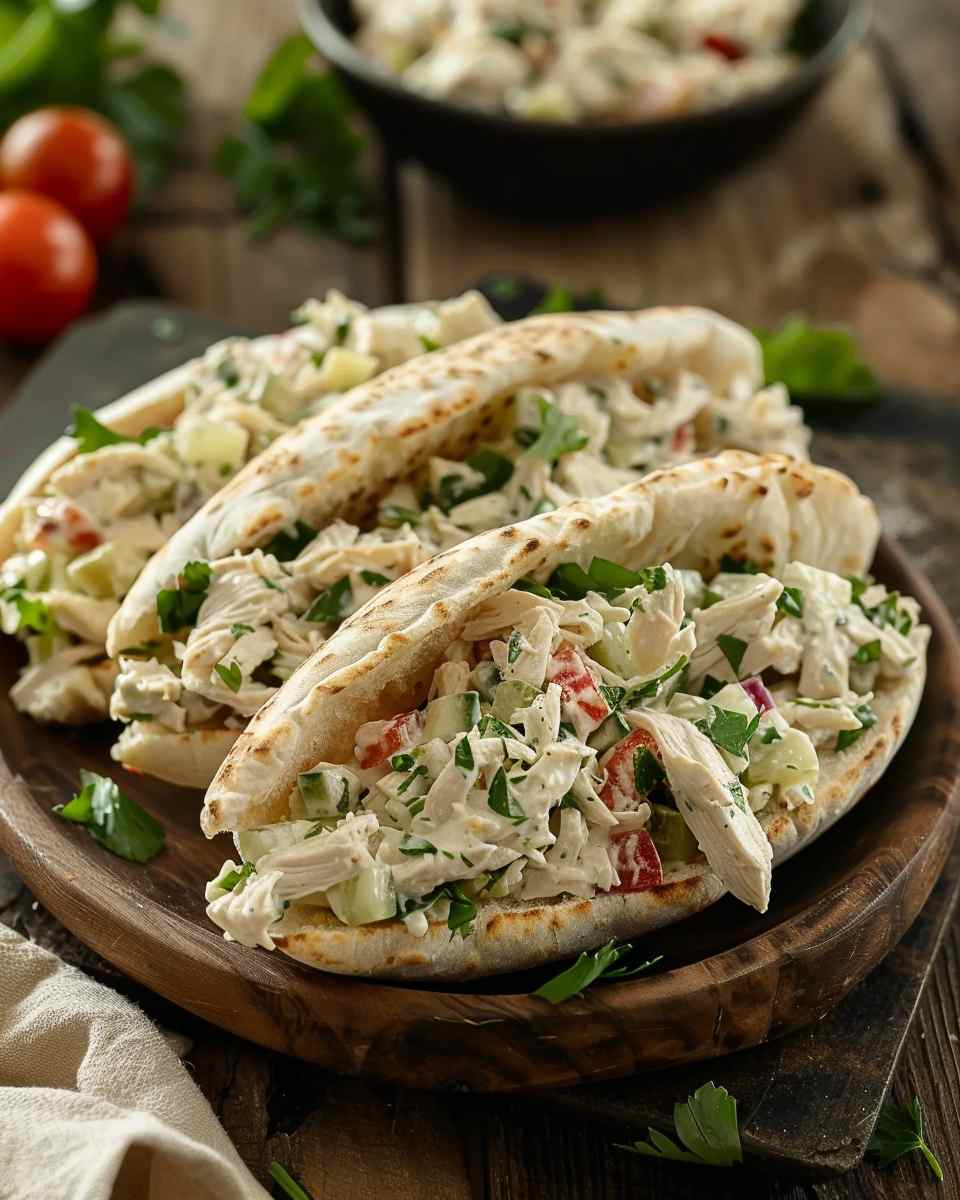 A fresh and creamy chicken salad stuffed into soft pita pockets, packed with crunchy vegetables and a light tangy dressing for a quick and satisfying meal.