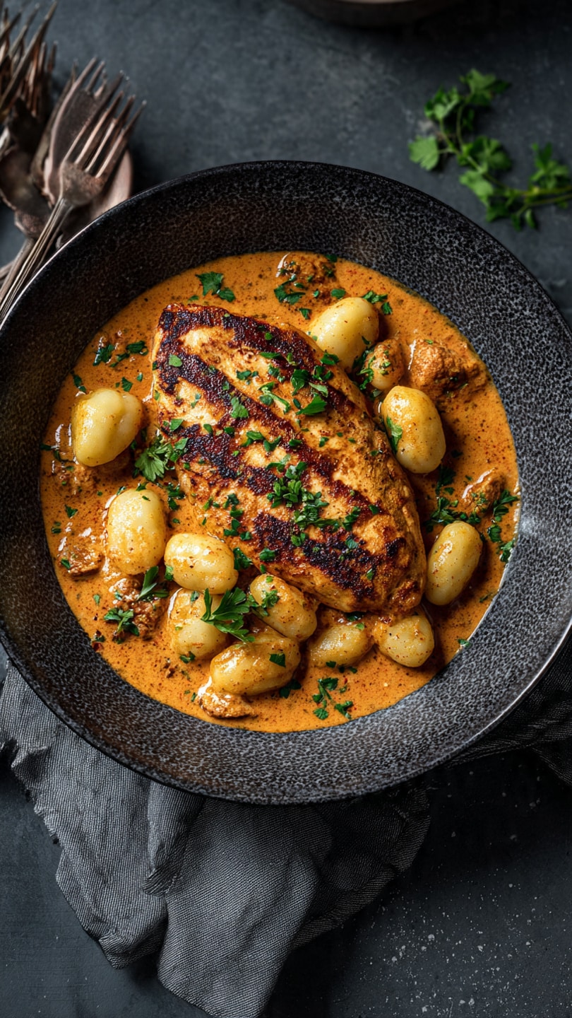 - Return cooked chicken to the pan. Add gnocchi and simmer for 7–10 minutes, until gnocchi is tender and sauce has thickened.