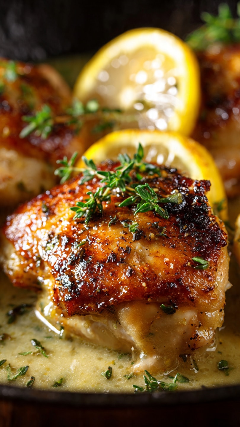 Tender pan-seared chicken breasts simmered in a rich lemon thyme cream sauce with garlic and parmesan, creating a bright yet comforting dish perfect for any occasion.