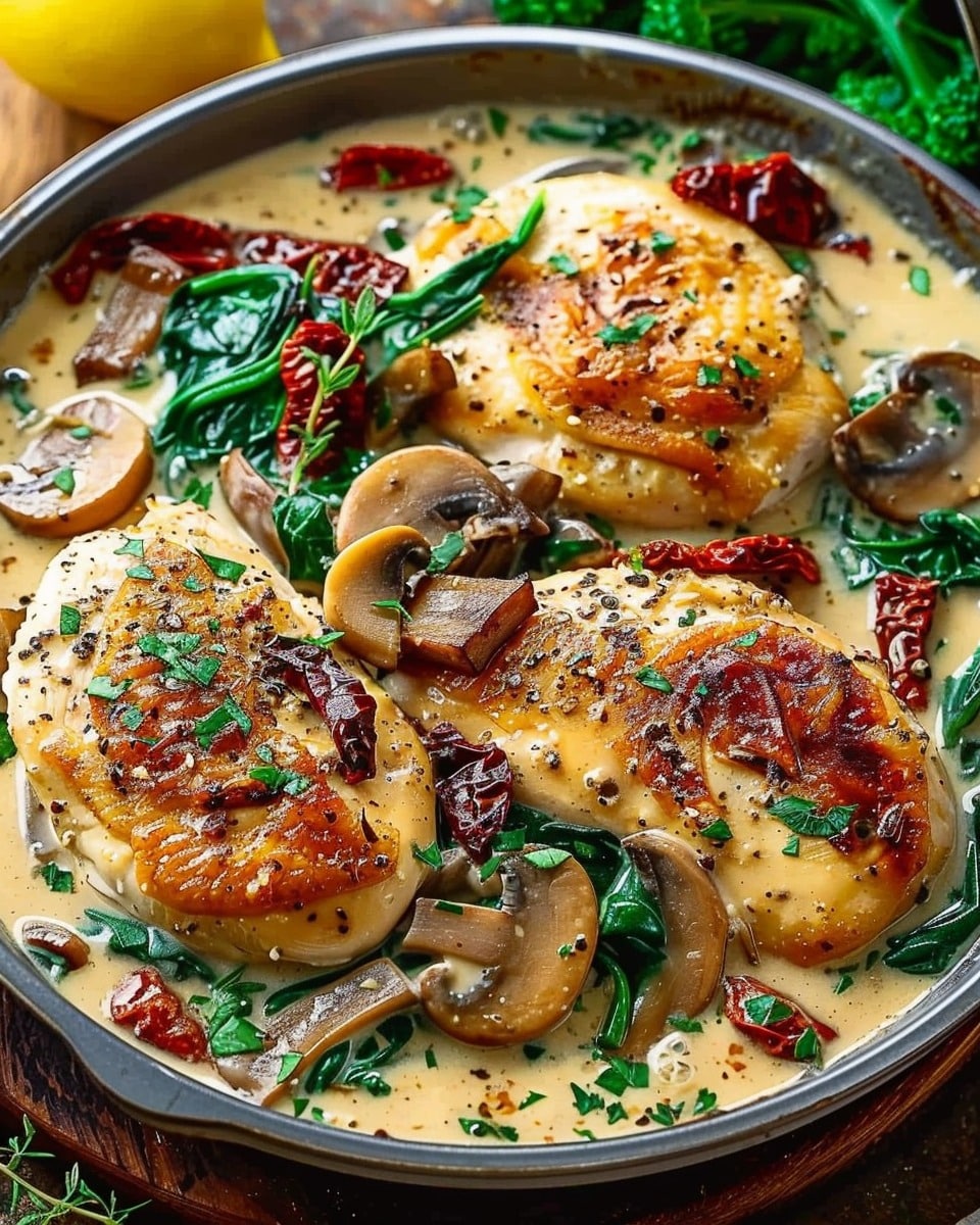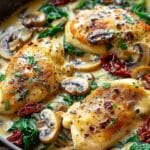Creamy Mushroom Chicken with Spinach, Sun-Dried Tomatoes & Lemon is a rich, flavorful one‑pan meal featuring juicy chicken in a velvety, tangy sauce with earthy mushrooms, sweet sun‑dried tomatoes, and bright lemon. It’s comforting yet elegant and pairs wonderfully with pasta, rice, or potatoes.
