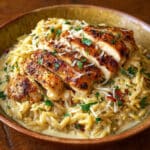I find this Creamy Parmesan Chicken and Orzo to be a dependable, comforting meal that always satisfies. The tender chicken, creamy orzo, and savory Parmesan come together in a way that feels both simple and indulgent. It’s a recipe I enjoy making again and again for an easy, flavorful dinner.
