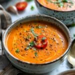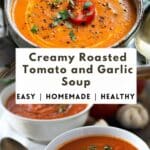 A warm and comforting creamy roasted tomato and garlic soup with deep, rich flavors from oven-roasted ingredients, blended into a smooth and satisfying dish.