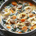 This creamy sausage tortellini soup with spinach and sweet potatoes is a hearty, comforting bowl of goodness that comes together in one pot. I love how the creamy broth wraps around the tender tortellini, savory sausage, and naturally sweet chunks of sweet potato. It’s filling without being too heavy and packed with flavor in every bite — perfect for cozy nights when I want something warm, rich, and satisfying.