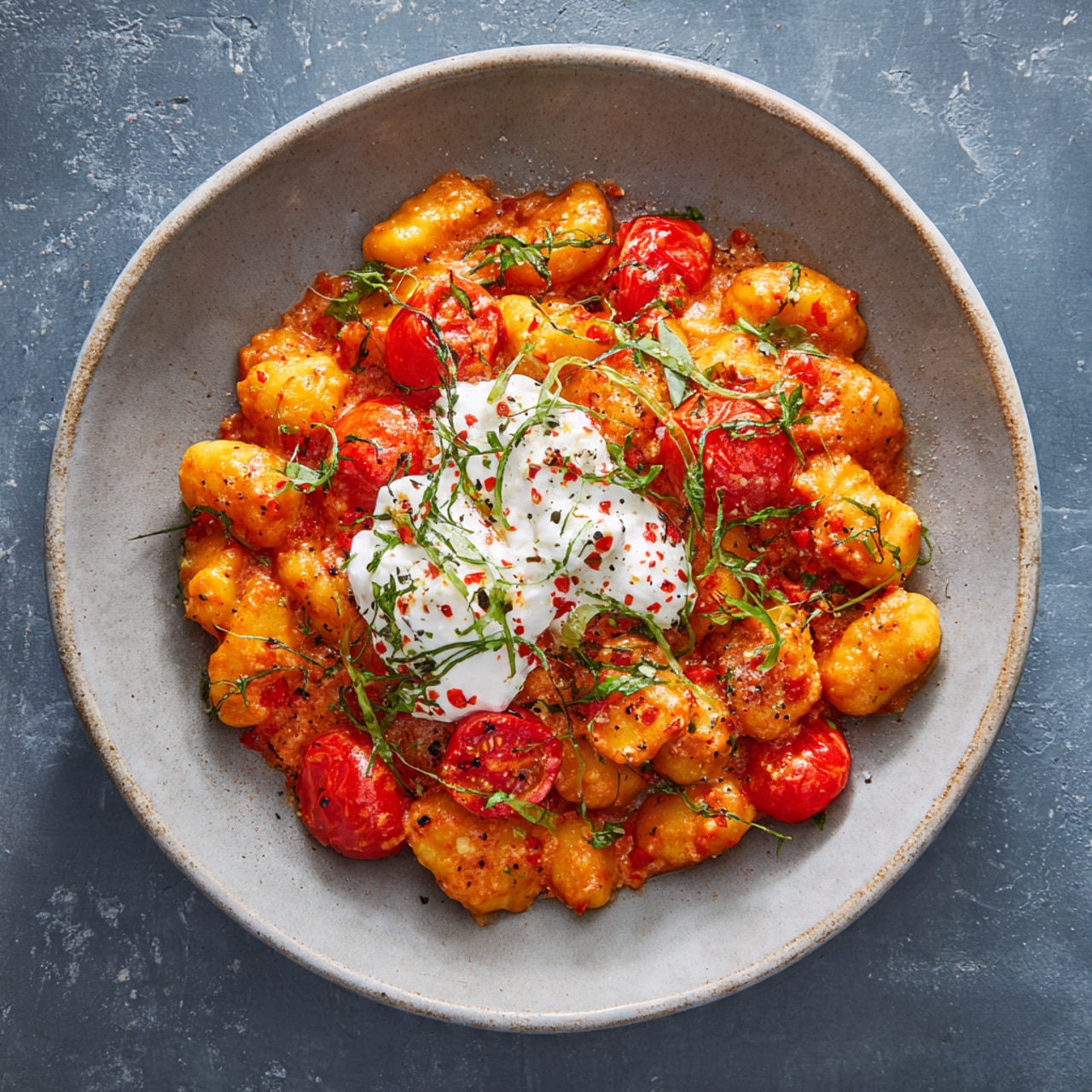 Soft, pillowy potato gnocchi tossed in a rich and creamy tomato sauce, finished with fresh burrata that melts beautifully into the dish for a comforting yet elegant meal.