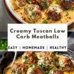 Rich and comforting low-carb meatballs simmered in a creamy Tuscan-style sauce with garlic, sun-dried tomatoes, and spinach, perfect for a satisfying keto-friendly meal.