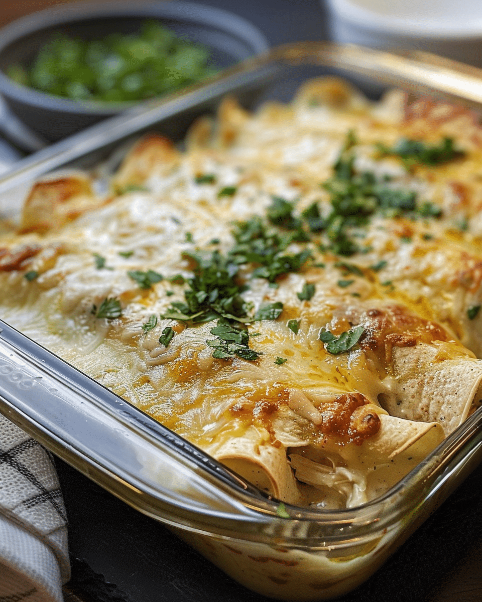 These creamy white chicken enchiladas with green chili sour cream sauce are a Tex-Mex comfort food favorite. Soft flour tortillas are filled with tender shredded chicken and cheese, then baked in a rich, tangy green chili sour cream sauce—perfect for family dinners or quick weeknight meals.