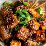 A flavorful and satisfying dish featuring golden oven-baked tofu that is crispy on the outside and tender inside, coated in a sweet, savory, and nutty sesame sauce.