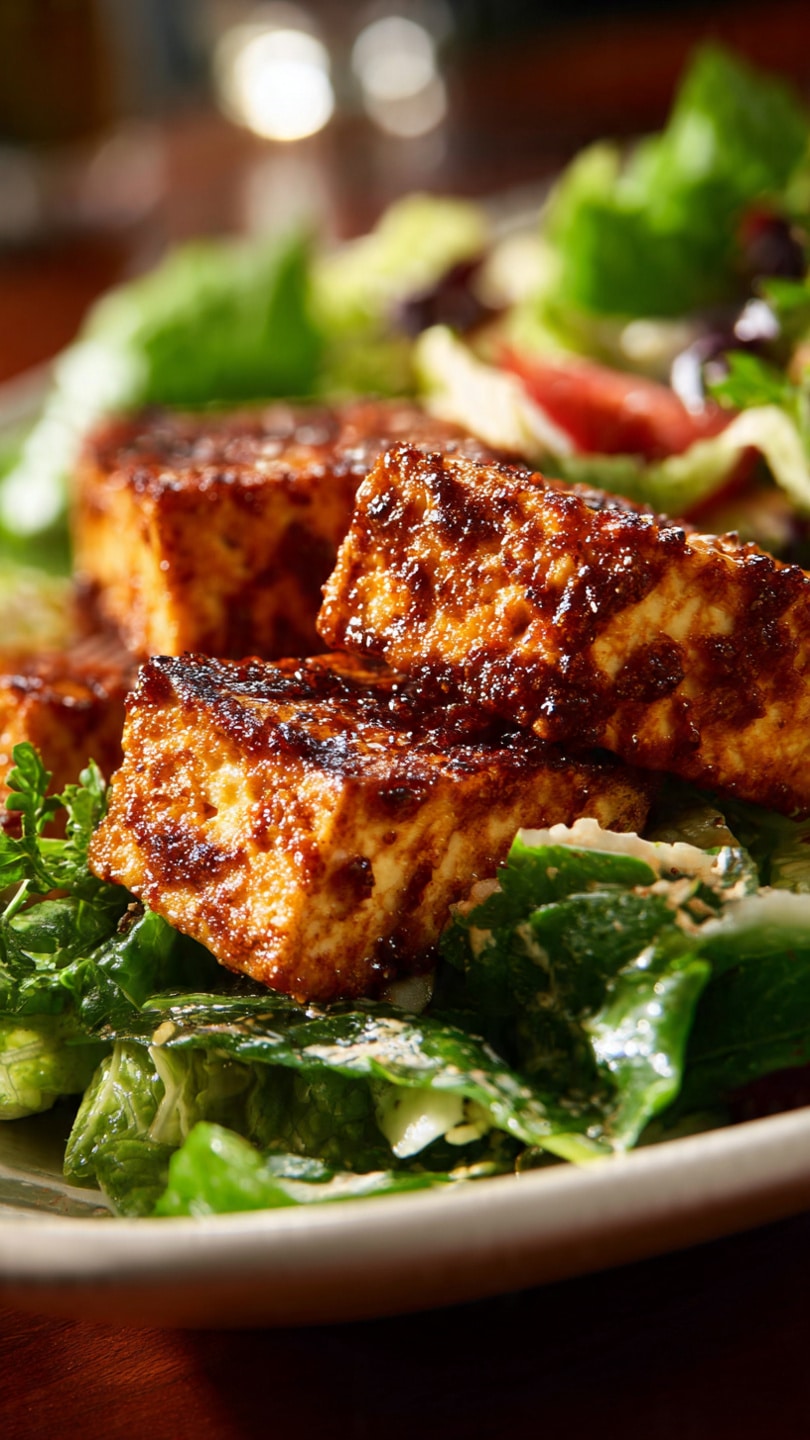 I store leftover tofu and salad separately in airtight containers in the refrigerator for up to 3 days. When reheating, I warm the tofu in a skillet or oven to keep it crispy. I keep the salad cold and assemble just before eating.