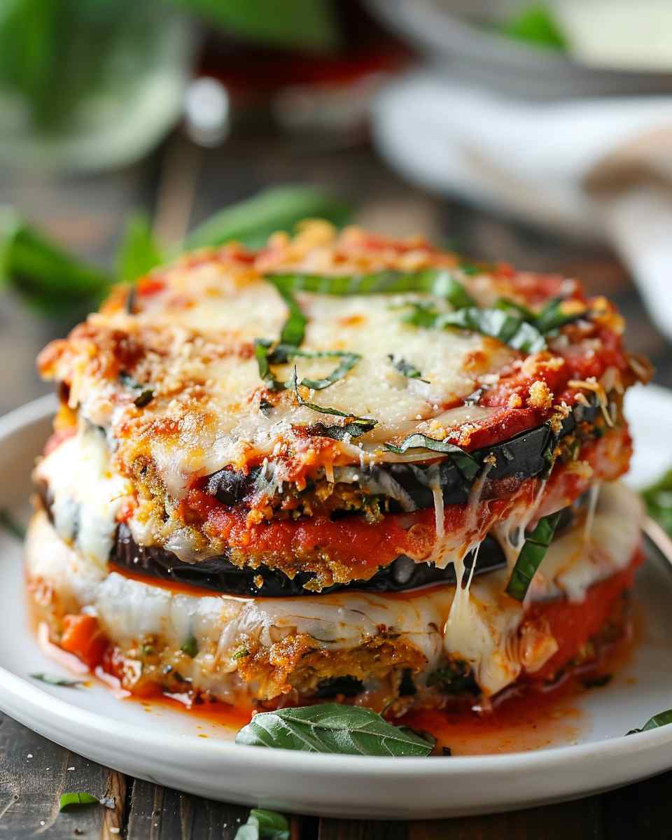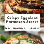 Crispy Eggplant Parmesan Stacks are a hearty vegetarian dish featuring golden breaded eggplant layered with marinara sauce and melted mozzarella for a comforting and elegant meal.