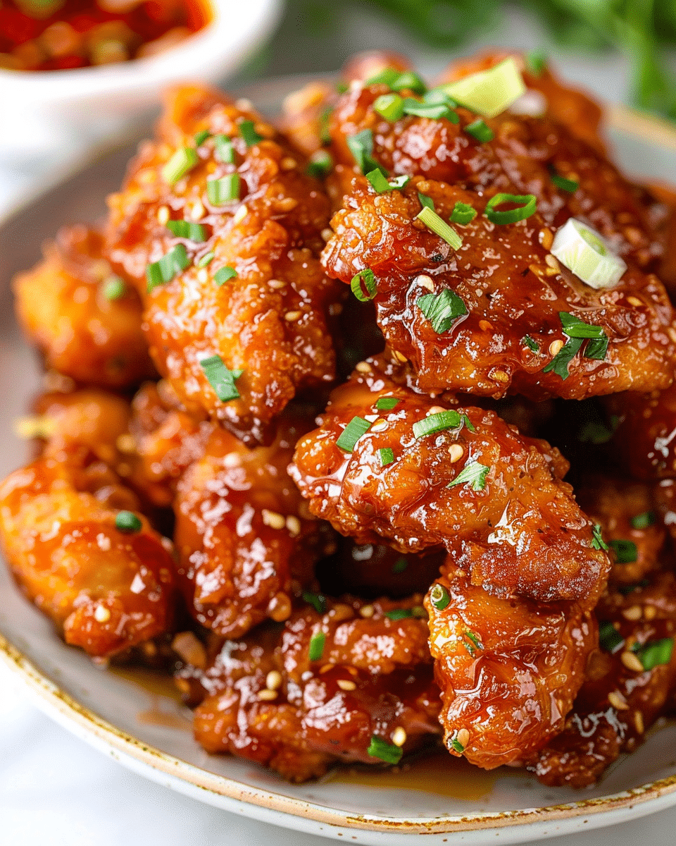 I sometimes bake or air fry the chicken instead of deep frying for a lighter version. If I want extra heat, I add more chili flakes or a spicier hot sauce. I also like adding sesame seeds or green onions on top for extra flavor.