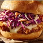 Crispy Mozzarella Chicken Sandwich with Tangy Slaw is the ultimate comfort food sandwich, featuring golden fried chicken cutlets topped with melty mozzarella and a zesty homemade slaw, all tucked inside toasted brioche buns.