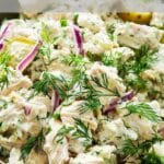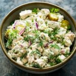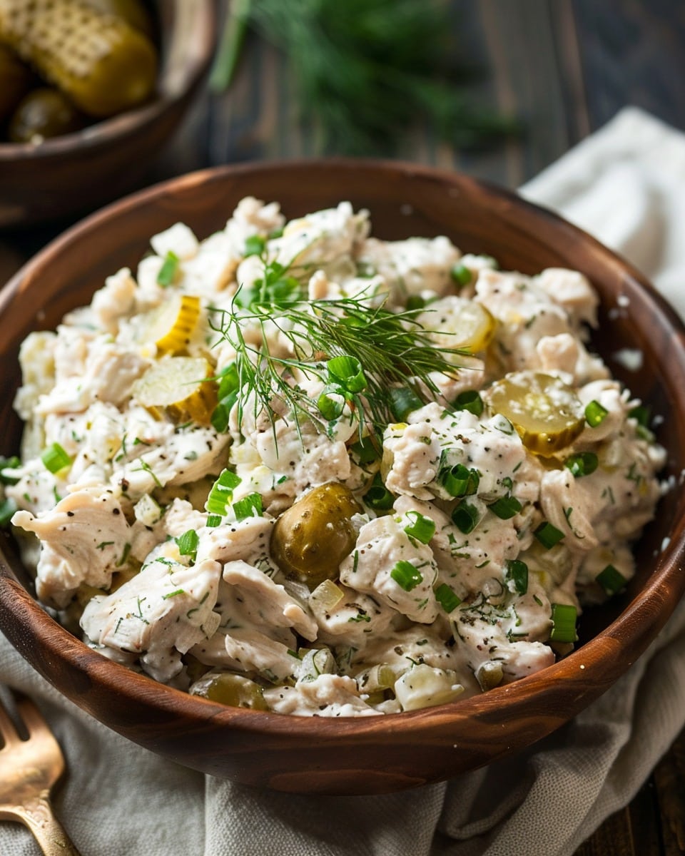 This Crunchy Dill Pickle Chicken Salad is a zesty, protein-packed dish made with tender chicken, chopped pickles, crisp celery, and a creamy dill-spiked dressing. Perfect for sandwiches, wraps, or snacking straight from the bowl!