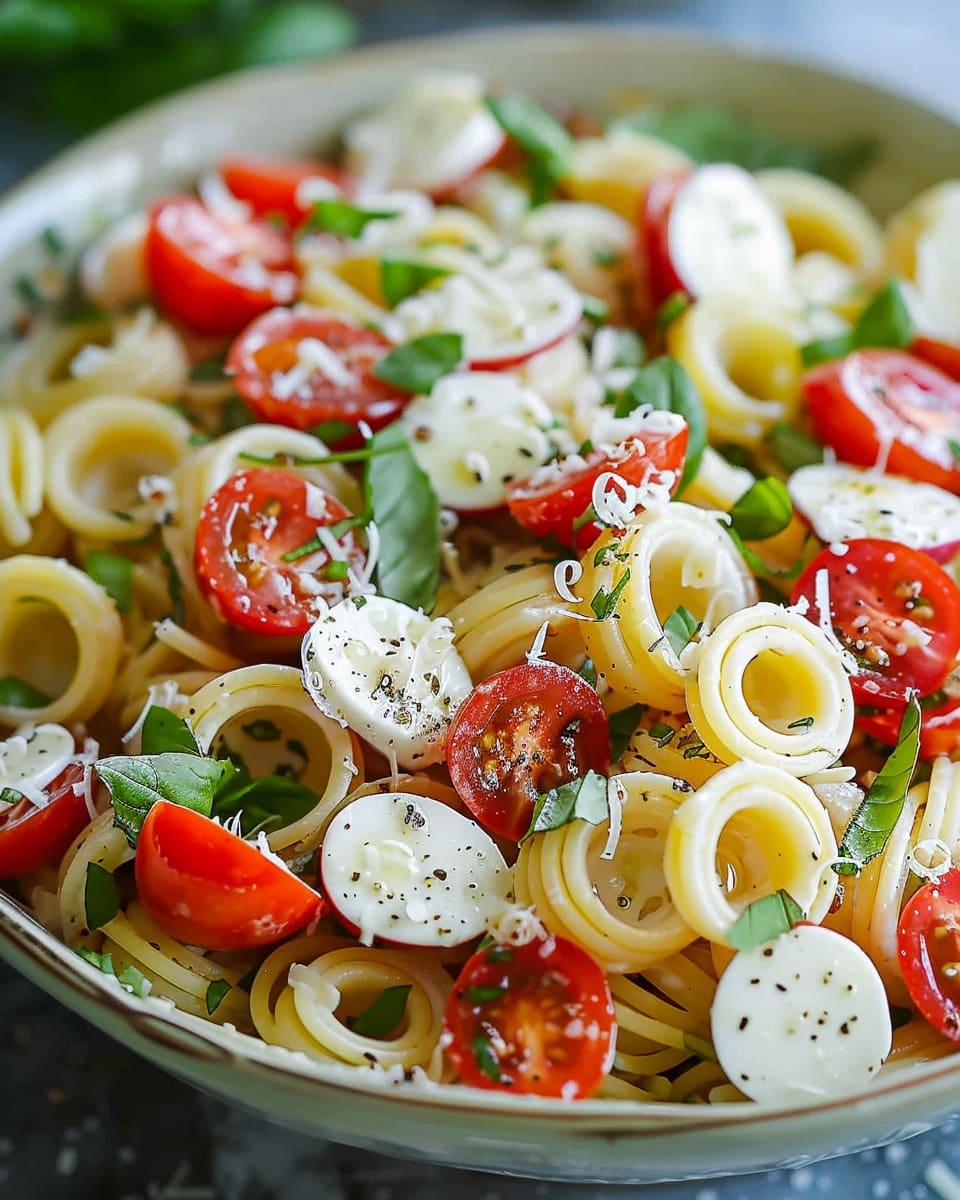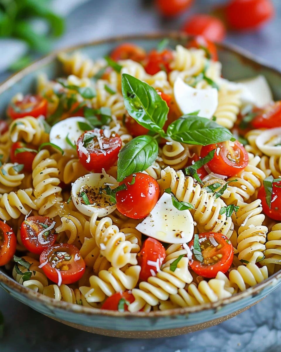 This Delicious Caprese Pasta Salad is a refreshing twist on the classic Caprese salad, blending juicy cherry tomatoes, creamy mozzarella, and fragrant basil with tender pasta and a balsamic dressing. Perfect for warm-weather meals, picnics, or quick lunches.