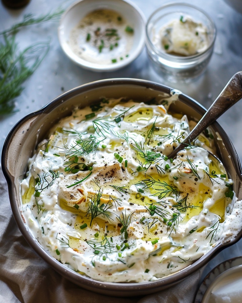 I use a thick, creamy tzatziki—either homemade or from the store. Plain Greek yogurt with garlic, cucumber, and lemon also works in a pinch.