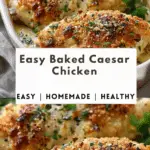 This Easy Baked Caesar Chicken is a weeknight dinner hero—juicy, tender chicken breasts baked in creamy Caesar dressing and topped with golden Parmesan cheese. With just a few ingredients and minimal prep, this rich, flavorful dish is a perfect go-to for busy nights or comfort food cravings.