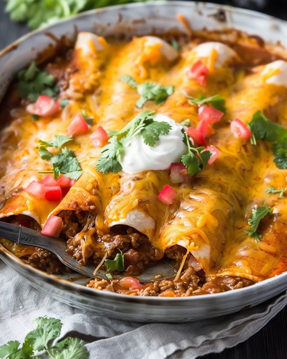 I spread a thin layer of enchilada sauce in the bottom of a baking dish. I fill each tortilla with the beef mixture and a bit of shredded cheese, roll them up, and place them seam-side down in the dish. I pour the remaining enchilada sauce over the top and sprinkle generously with more cheese.