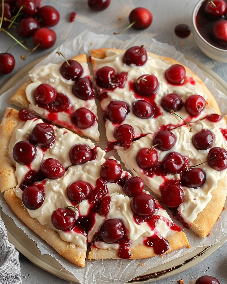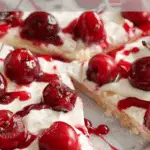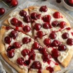 Easy cherry dessert pizza is a vibrant and simple treat with a sugar cookie crust, creamy vanilla frosting, and a sweet cherry topping. Perfect for parties, holidays, or an easy make-ahead dessert.