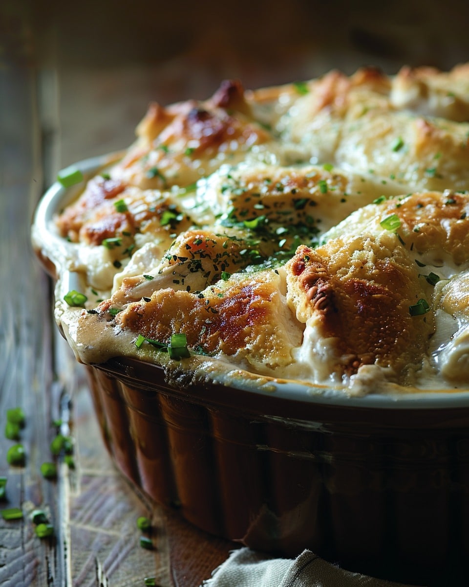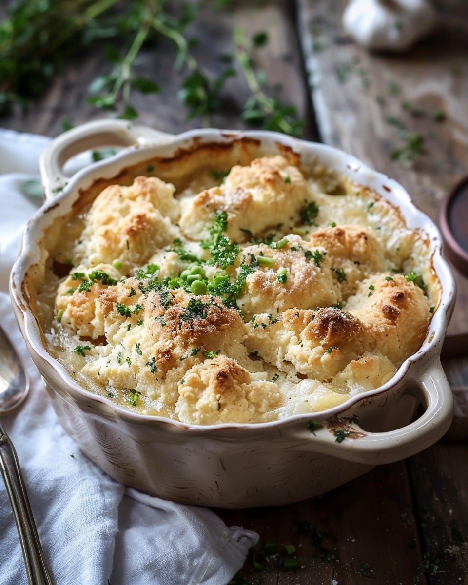 A warm, creamy comfort-food casserole made with tender chicken, vegetables, and a soft golden biscuit topping baked together in one easy dish.