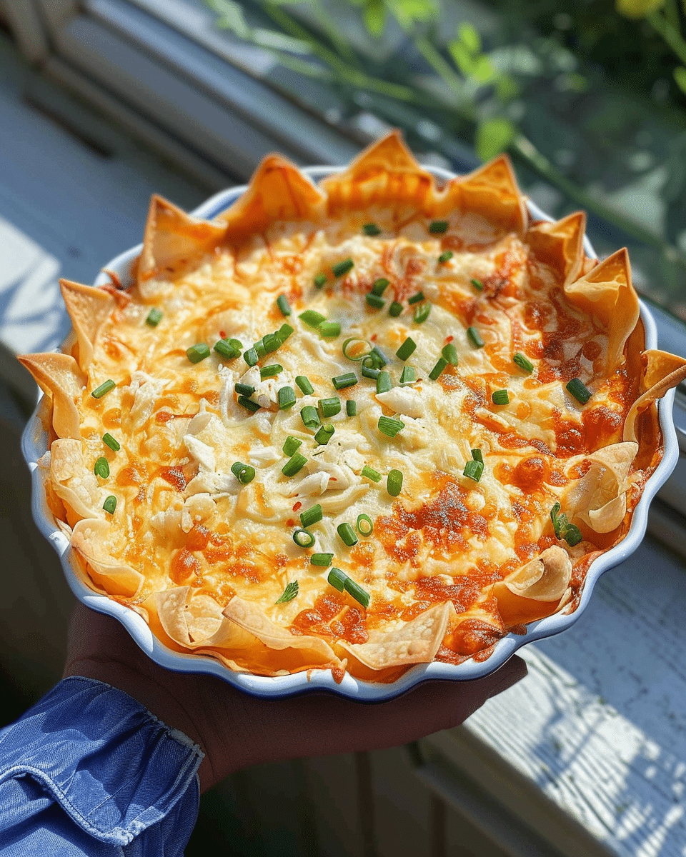 - Serve the dip hot, garnished with green onions, alongside wonton chips.
