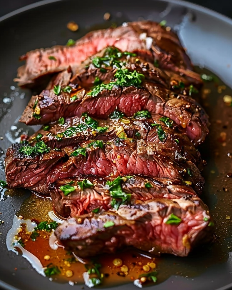 - I remove the steak from the pan, let it rest for 5 minutes, and sprinkle with chopped parsley before serving.