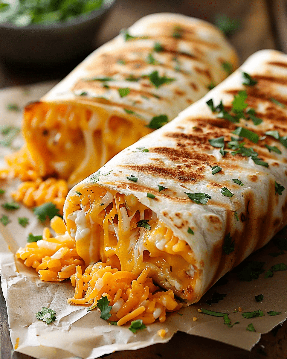 I heat a clean skillet or griddle and sprinkle shredded cheddar and mozzarella directly onto the surface in a rectangle about the size of the burrito.