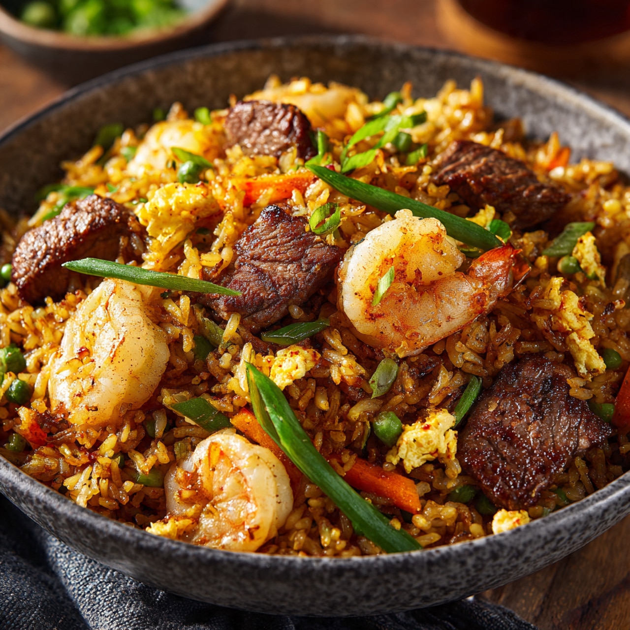 I love this recipe because it delivers bold flavors with simple ingredients. The steak and shrimp add richness and protein, while the fried rice absorbs the savory seasoning and becomes incredibly flavorful.