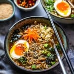 I love this recipe because it’s quick, customizable, and hits all the right notes—savory broth, chewy noodles, crisp vegetables, and protein-packed toppings. I can use whatever I have on hand, whether it’s leftover chicken, soft-boiled eggs, or fresh greens, and the result is always deeply satisfying. Plus, making ramen from scratch allows me to control the flavor and saltiness of the broth, making it healthier than instant alternatives.