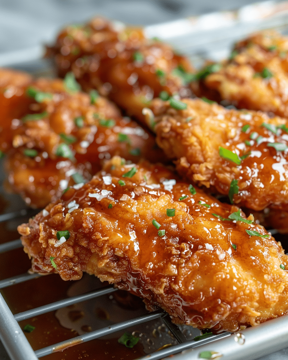 - Heat oil in a large skillet over medium-high heat. Fry chicken in batches until golden and crispy. Drain on paper towels.