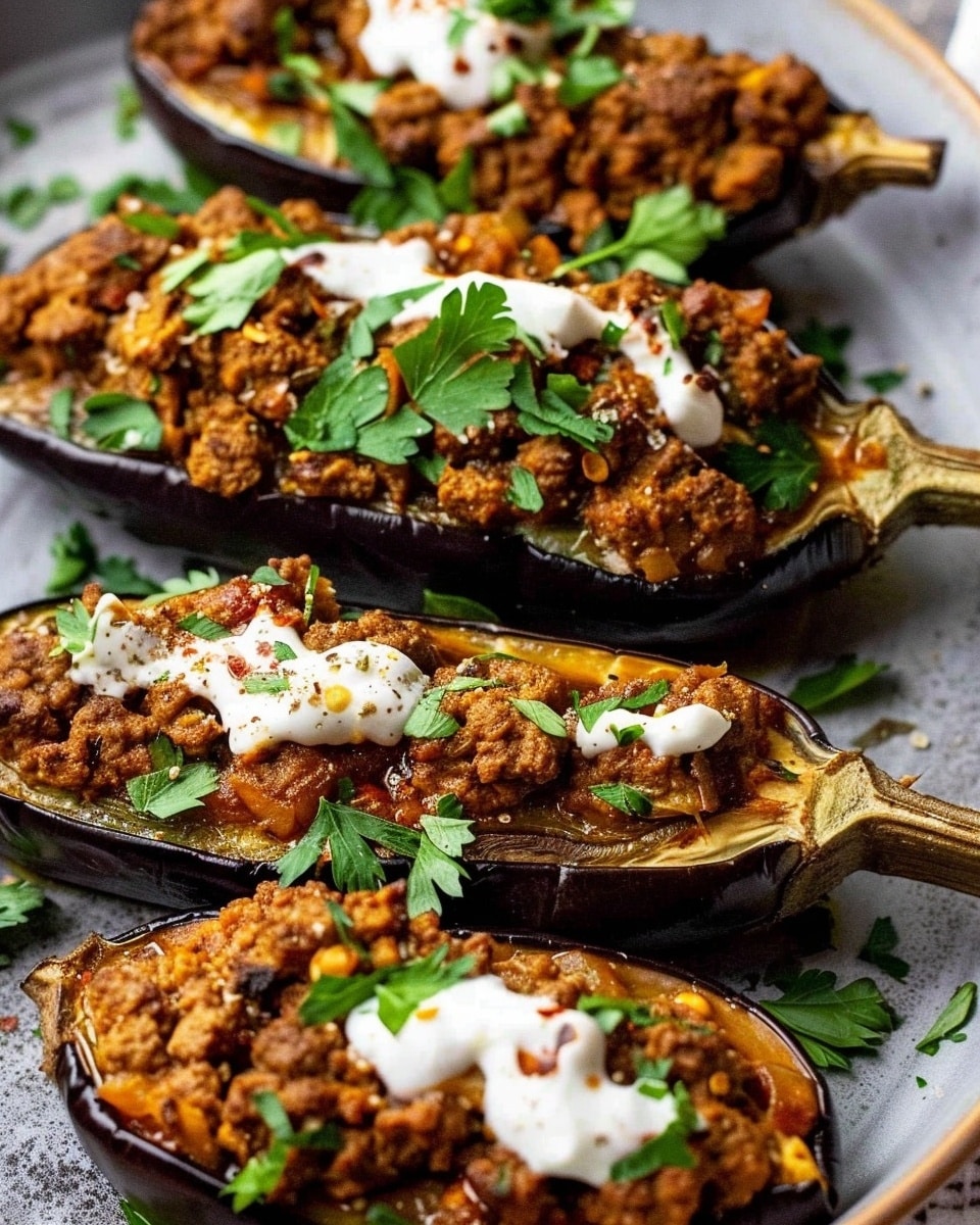Easy Moroccan Stuffed Eggplant is a vibrant, spice-packed dish featuring tender roasted eggplant halves filled with a savory blend of ground meat or legumes, Moroccan spices, and tomatoes. Finished with yogurt or tahini and fresh herbs, it’s a hearty yet light meal perfect for weeknights or entertaining.