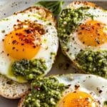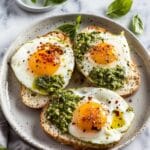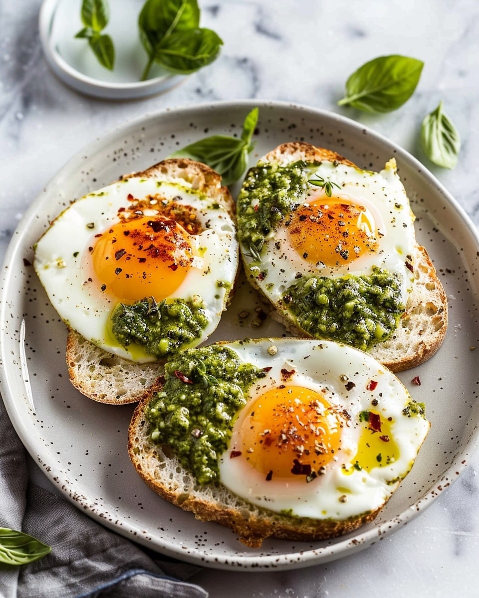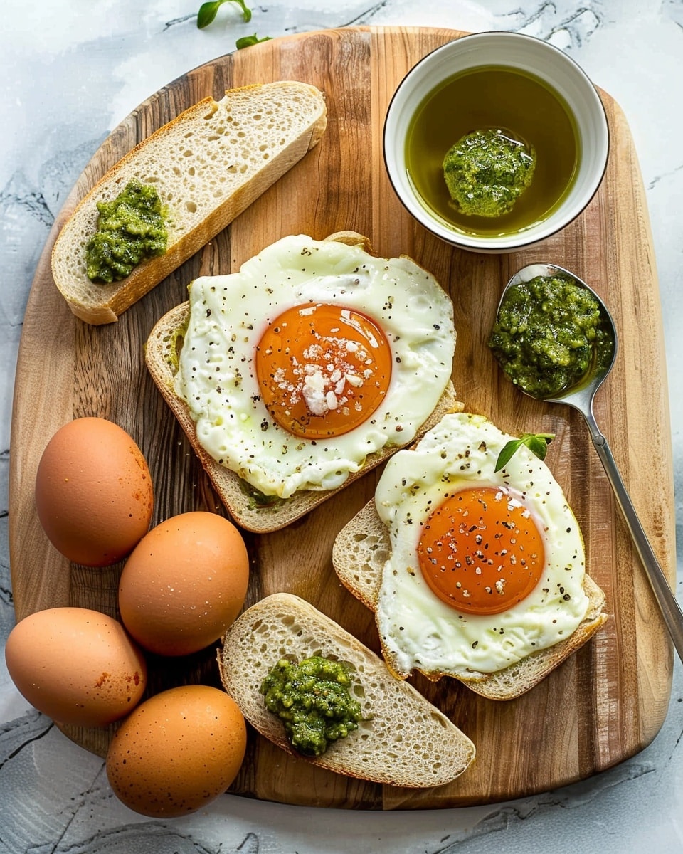 I sometimes use scrambled eggs instead of fried eggs for a softer texture. I also enjoy adding sliced avocado, crumbled feta, or fresh cherry tomatoes on top. When I want extra protein, I add a slice of smoked salmon or a spoonful of cottage cheese. If I am feeling adventurous, I switch up the pesto and use sun-dried tomato pesto or arugula pesto for a different flavor profile.