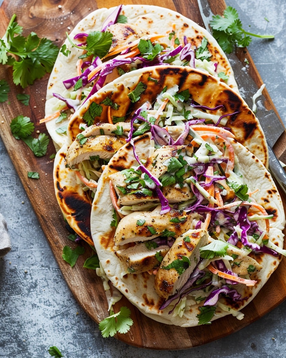 I warm the pita bread, then fill each with chicken and a generous scoop of herb ranch slaw. I add any extra toppings I like and serve immediately.