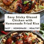 A delicious takeout-style meal featuring juicy chicken coated in a sweet and savory sticky glaze, served with flavorful homemade fried rice for a complete and satisfying dish.
