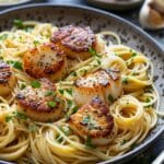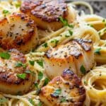 Elegant Seared Scallops Over Garlic Pasta is a restaurant-worthy dish that I can make right at home with just a few simple ingredients. I love how the golden-brown scallops pair perfectly with the buttery garlic pasta—it’s rich, delicate, and impressive without being fussy. Whether I’m cooking for a special occasion or just treating myself, this recipe never disappoints.