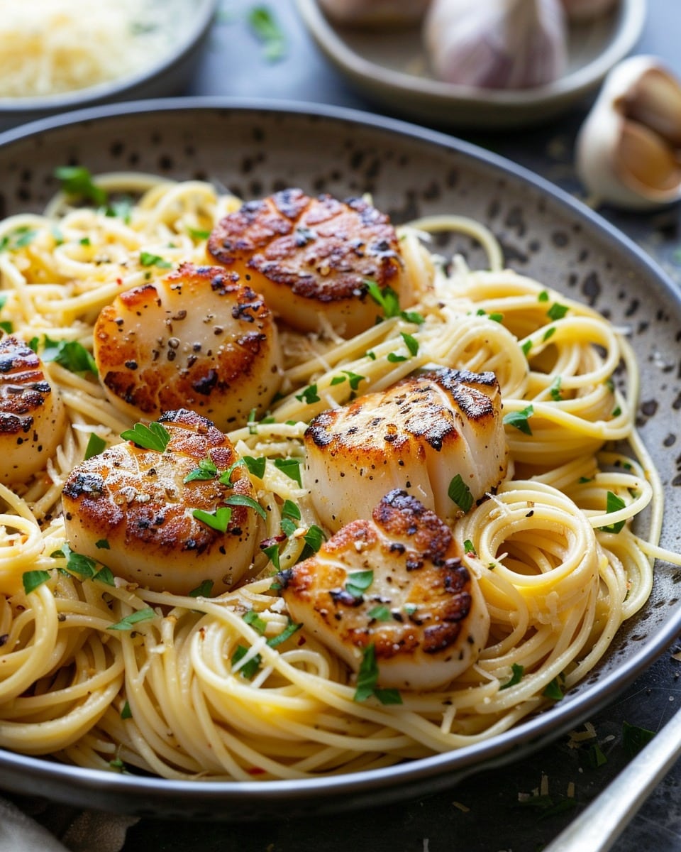 Sometimes I swap the scallops for shrimp or add spinach and cherry tomatoes to the pasta for more color. I’ve also used a white wine reduction with the garlic sauce for a deeper flavor. If I want a creamier pasta, I stir in a splash of heavy cream or a bit of grated cheese at the end.