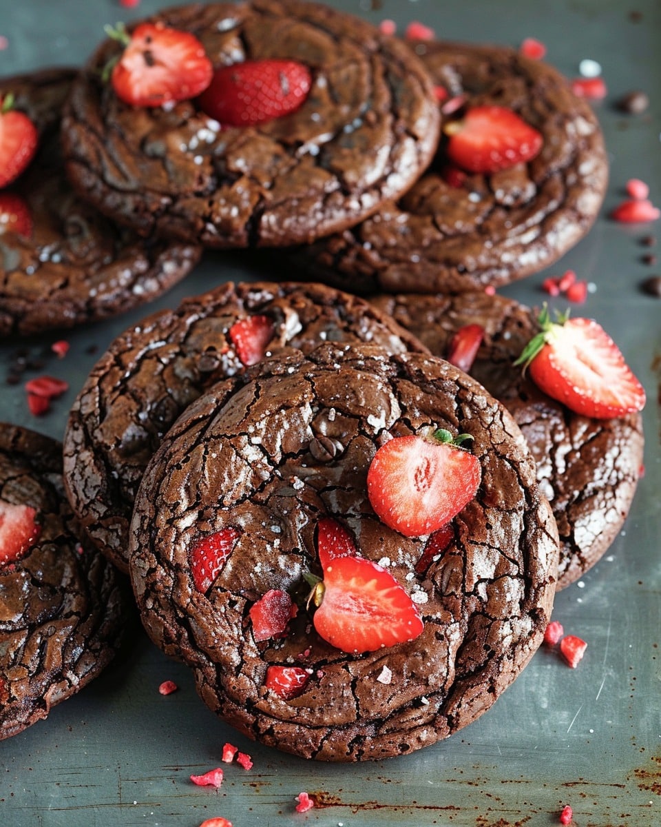 Soft and fudgy brownie-style cookies infused with espresso and studded with crushed freeze-dried strawberries, creating a rich chocolate treat with a subtle coffee boost and fruity sweetness.