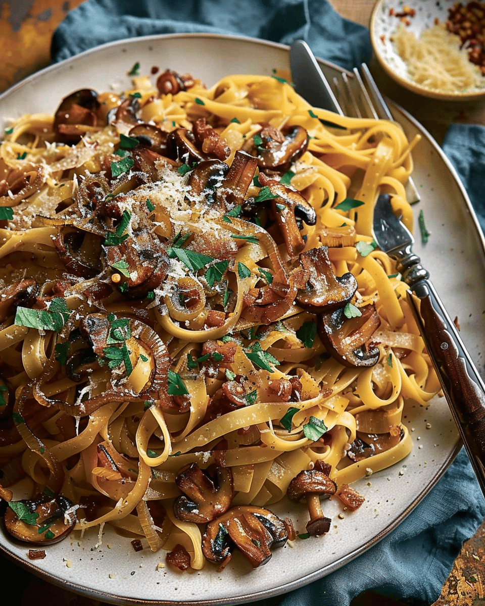 Sometimes I swap in tagliatelle or linguine instead of fettuccine. If I want to make it heartier, I stir in a handful of spinach or baby arugula at the end. I’ve also added a splash of white wine before tossing in the mushrooms for a little extra depth. And when I’m in the mood for protein, I’ve topped it with a soft-boiled egg or a handful of toasted walnuts for crunch.
