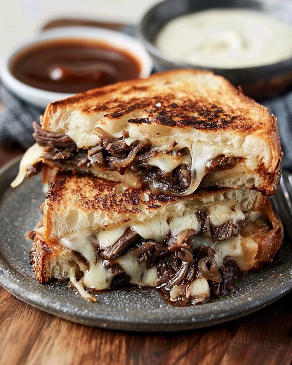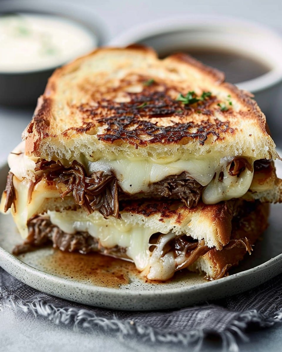 I love how this recipe combines the best parts of a French dip sandwich with the crispy, golden goodness of grilled cheese. The juicy roast beef paired with melted provolone (or Swiss), tucked between buttery slices of bread, is irresistible. And the homemade or store-bought au jus takes it to a whole new level. It’s great for a quick meal, but fancy enough to serve to guests too. It’s rich, hearty, and incredibly crave-worthy.